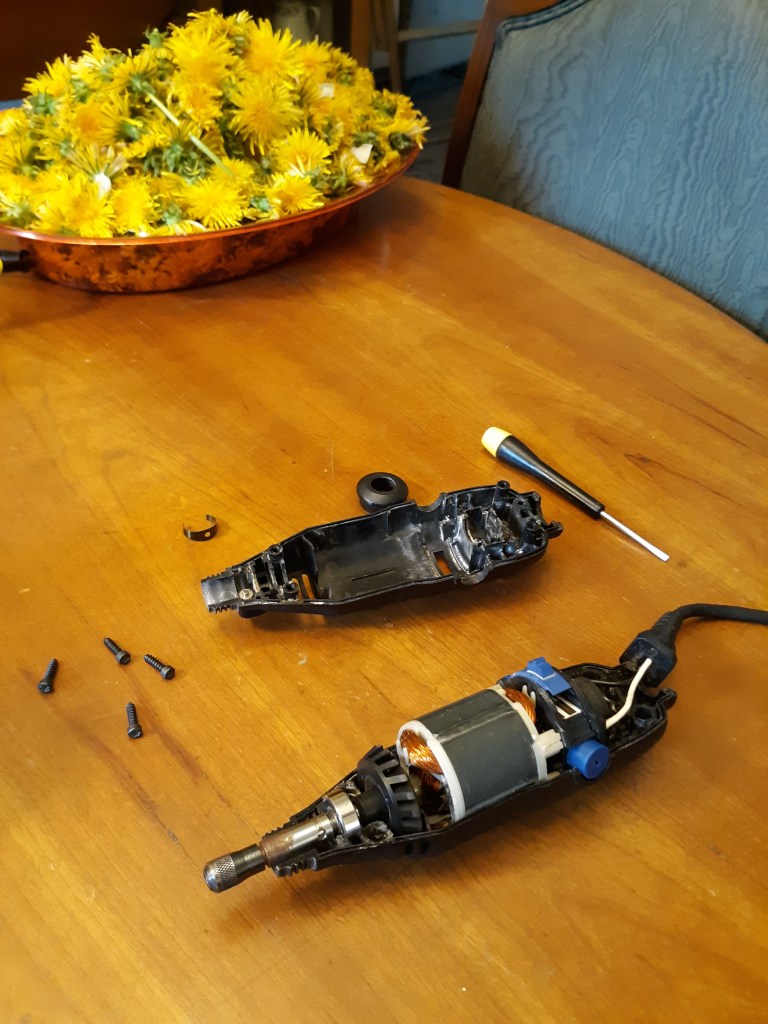 At first, I wasn’t worried. I thought it had overheated, and would just need a fuse. We looked at some “how to” videos and took the tool apart. There was no discernible thermal fuse that we could find. Without totally tearing the cardboard/wire structure apart, we would not be able to fix it, but with it torn apart, how would we get it back into the case and use it?