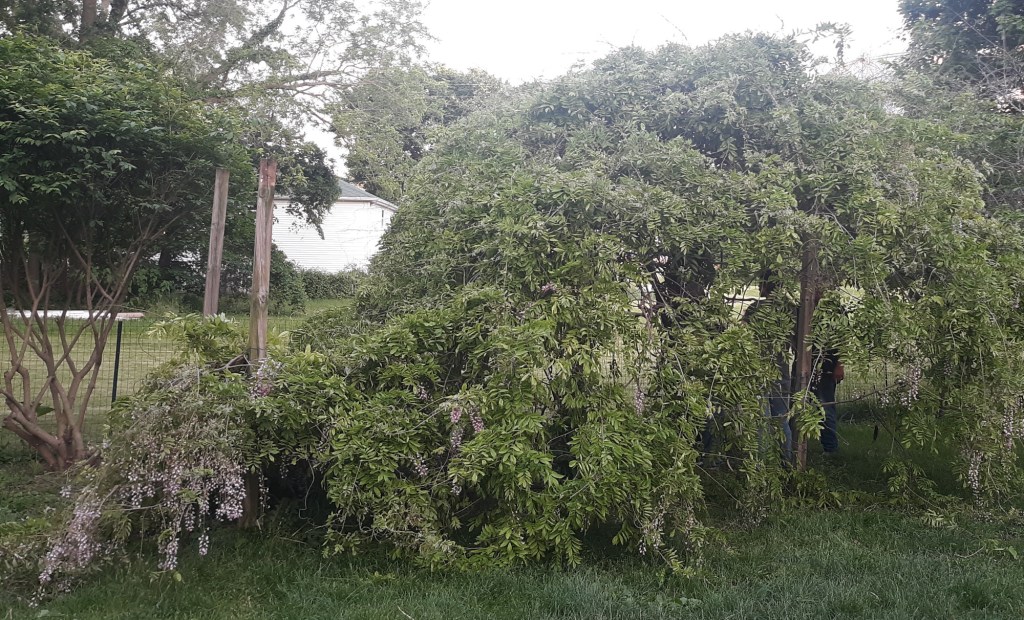 I know it wasn’t wrong to want a beautiful wisteria. But it was much more important for me to have a big garden in the best part of the yard. I had already decided that. So cutting back the wisteria was a greater good, but I wavered because of the spectacular beauty it displayed this year.