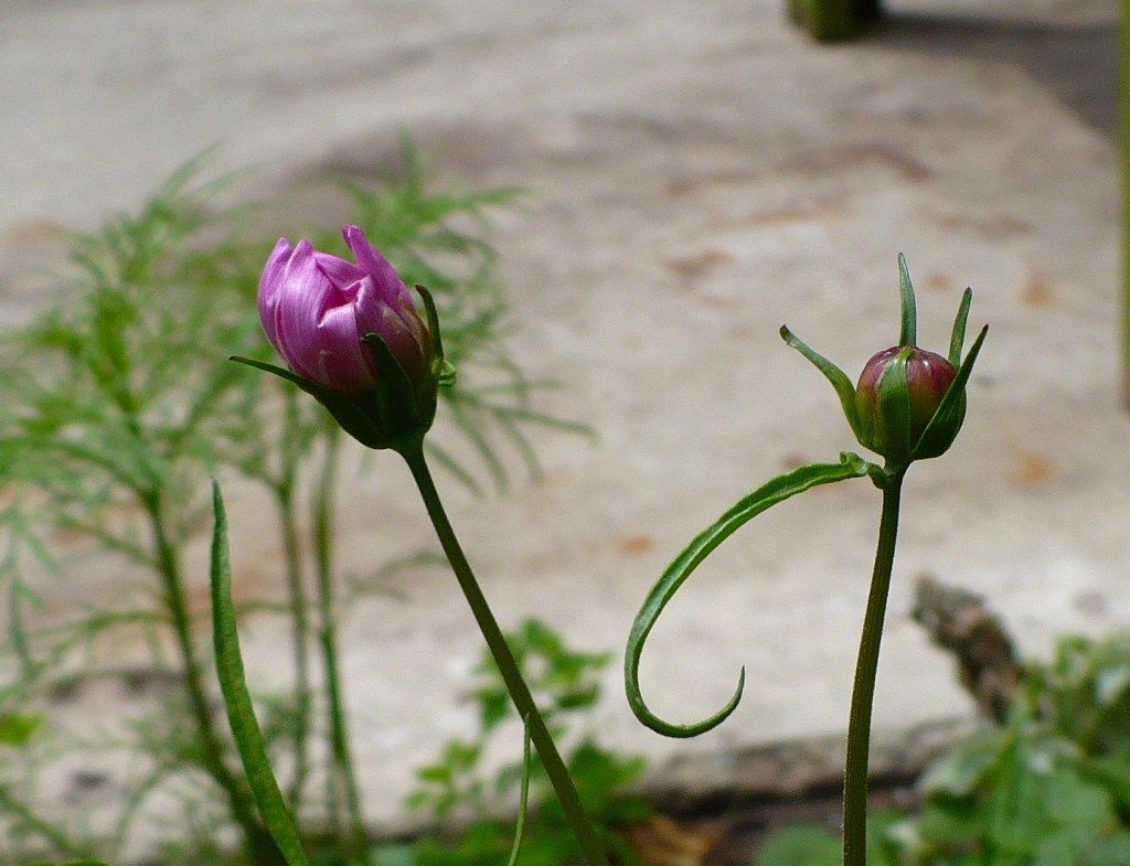 The cosmos first surprised me with delicate, needle-thin foliage, and then astonished me with six-foot height! The flowers began to appear as daisy-like (white, pink and wine-colored) floating above thin stems.