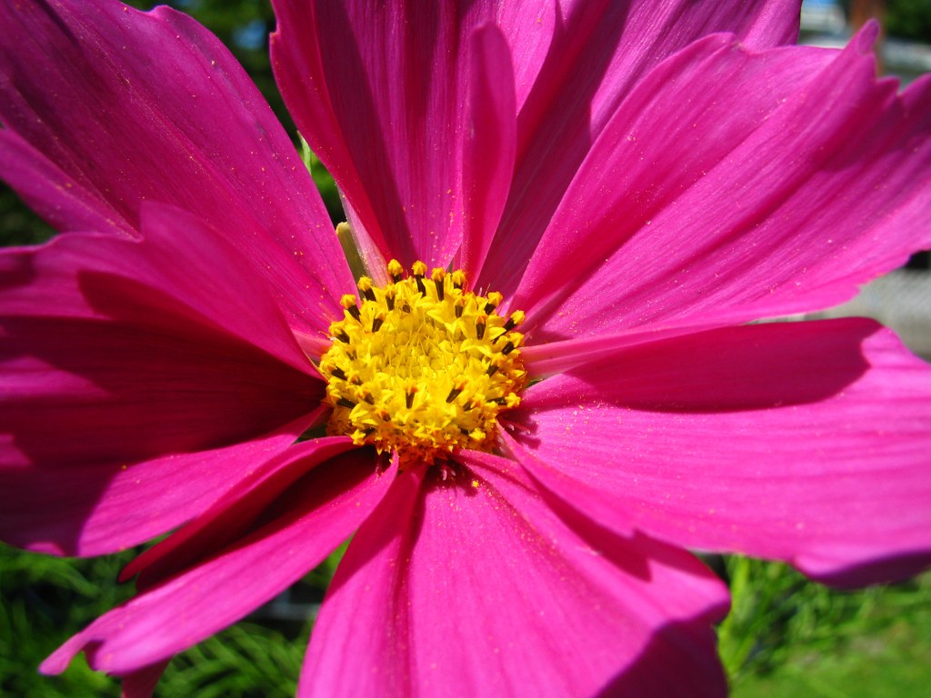 The new fully-opened cosmos flower has a smooth center, velvety and soft, made of spiraling rows of anthers waiting to mature and emerge. In another, more-mature flower, a ring of those anthers emerged around the perimeter of the center, each anther like a tiny five-pointed star with a filament tail. The little cylinder the anther emerged from then emerged about half as far, like a tiny star-shaped flower. No wonder they named this plant “Cosmos!”
