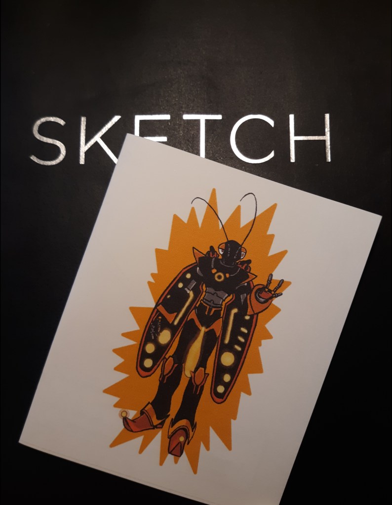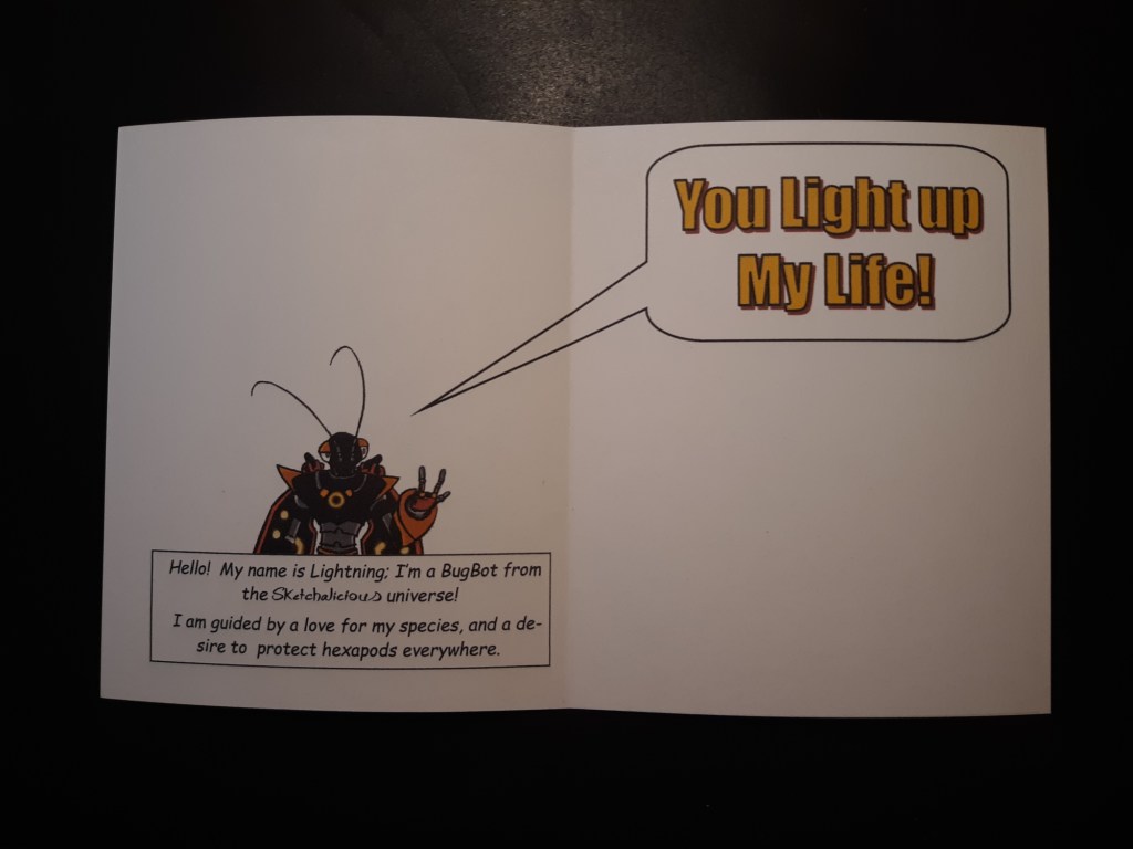 Beau has decided to introduce one of his latest characters, a “Bugbot,” as a greeting card. And as a bonus, it’s in full color.