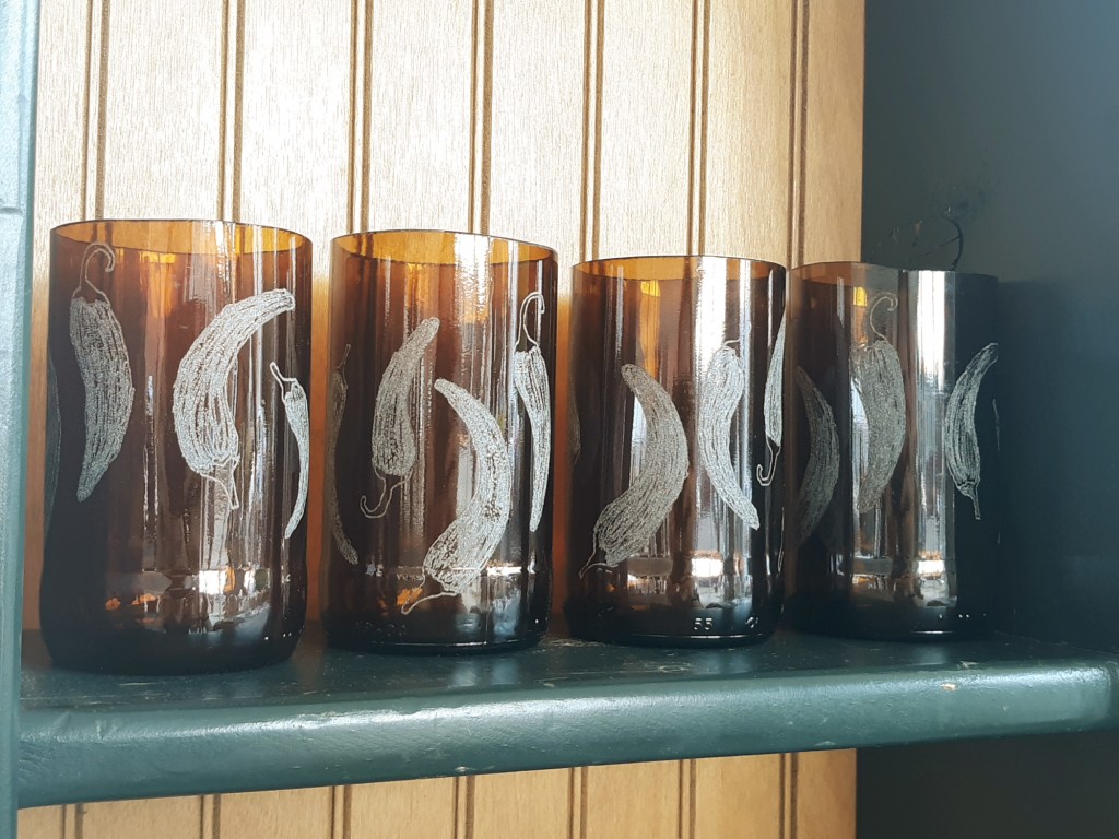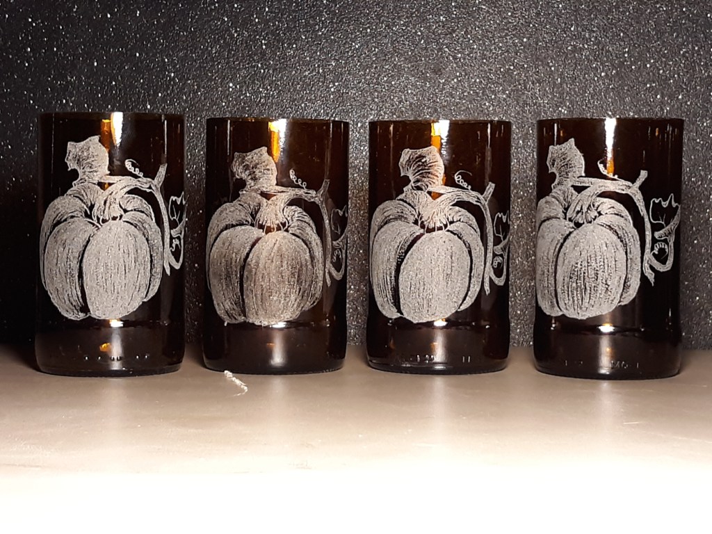 Each of these original designs is engraved on the glass with a rotary tool. I use the same basic reference drawing for each design, but since each glass is etched manually, there are some differences if you look closely. That’s how you know for sure they are done by hand!