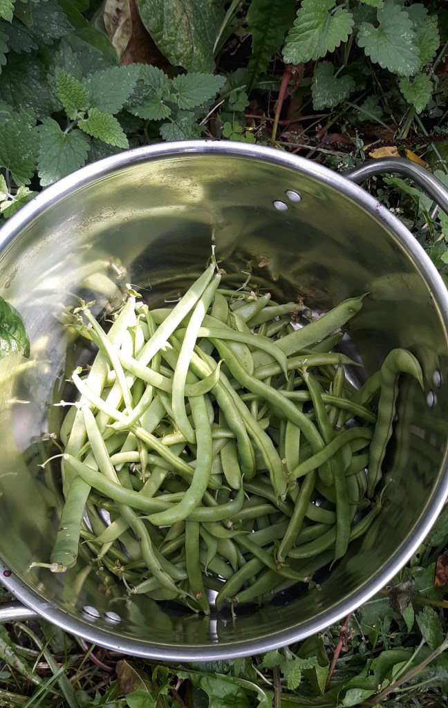 I started in the bean patch, because I had heard that the chilly nights would slow down the ripening process. But maybe our beans didn’t get the message, or maybe they are like me: They get started and just can’t stop. At any rate, they are still producing like crazy, so we still have fresh green beans in late September.