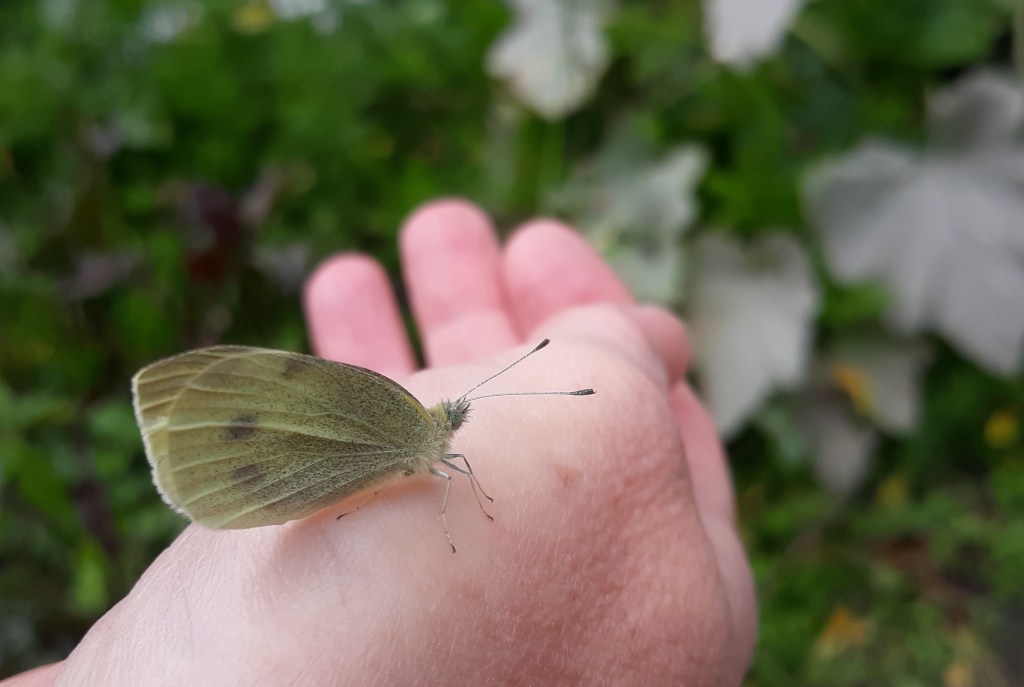 Because they are cold-blooded, insects can become stranded in the fall. I hoped that was the case with this little one. We shielded her from the wind and blew on her a little to warm her up, and she was just fine. In fact, she flew over to my hand and said a proper “thank you.” Her little feet felt so light, almost couldn’t feel them at all. What a treasure to hold a butterfly in my hand! It doesn’t happen very often.