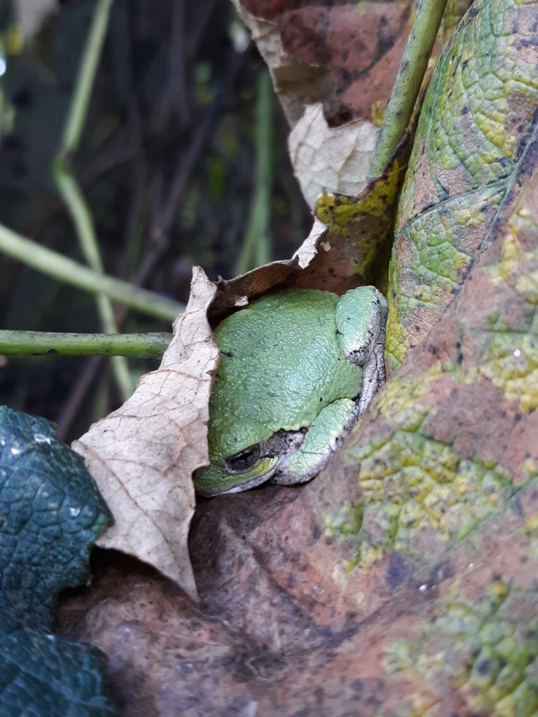 And last, but not least, we found an adorable little tree frog, nestled among the grape leaves. Full disclosure–he was’t at our place, but since we found him today, I figured he counts. Though we waited expectantly, he was not inclined to sing.