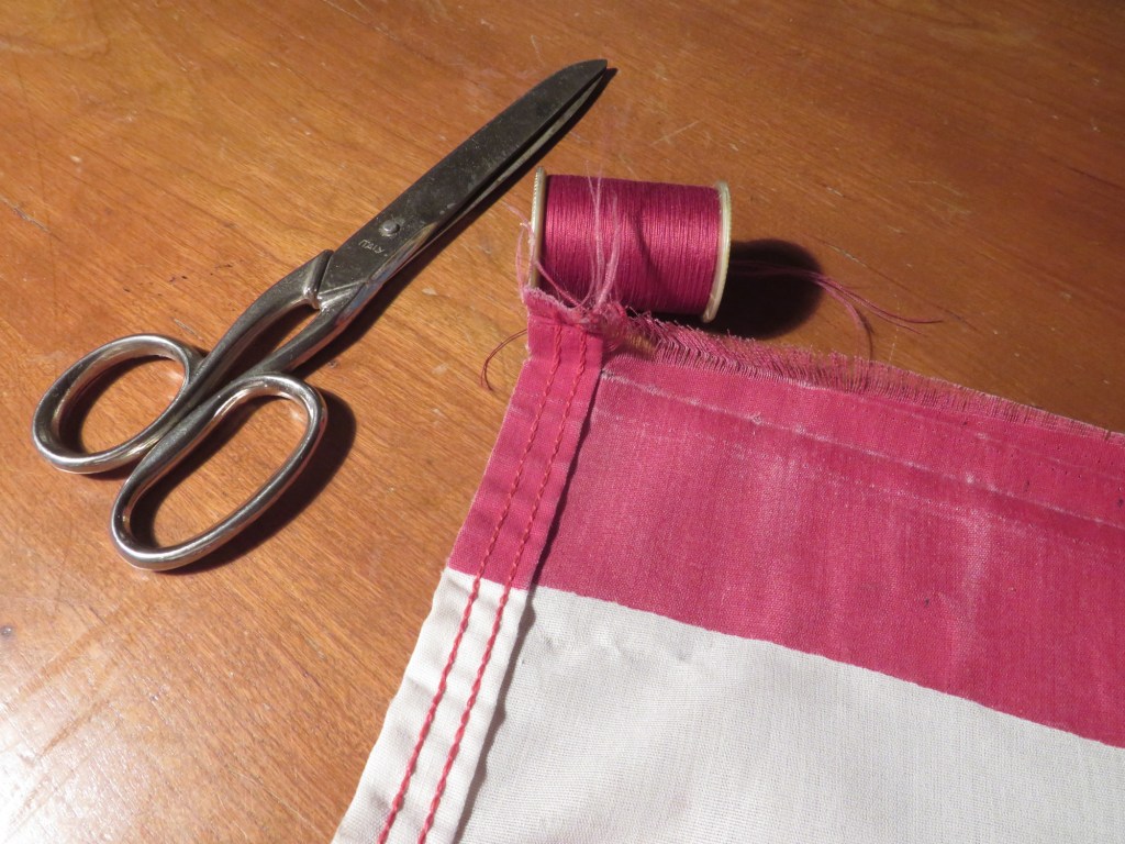 This morning, when my husband was about to raise the flag, he noticed a few strands of thread. On closer inspection, he realized that the seam had pulled loose along one side. He asked me if I could repair it. Of course, I said I would.
