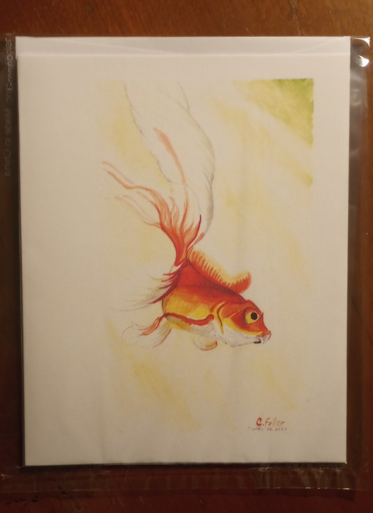 This dreamy goldfish artwork is by Carolyn Fuller. Blank inside.