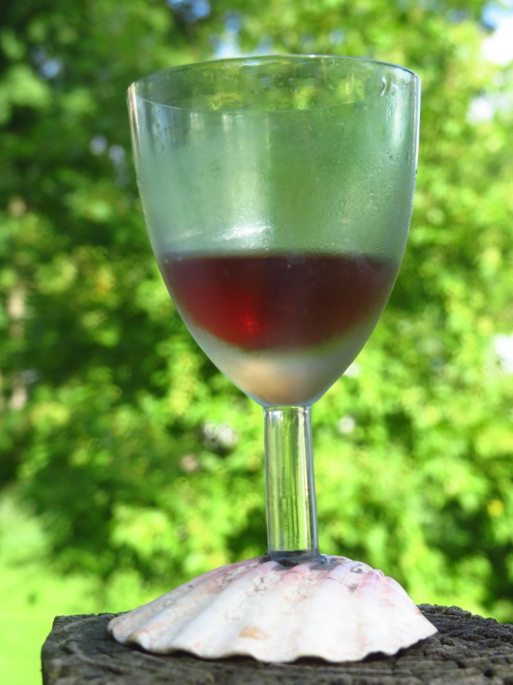 How do you like my snazzy snifter? Tony brought me a taste in this cordial glass that I repaired using a shell. (I never know what kind of flavor I’m going to experience in these tasting adventures, so a smaller glass is prudent.) His root beer tastes a little like the commercial varieties–you can tell it’s in the same genus–but it’s less fizzy and more pungent. After drinking, it warms up my insides! (It might be the spices he uses: cinnamon, cloves and allspice.)