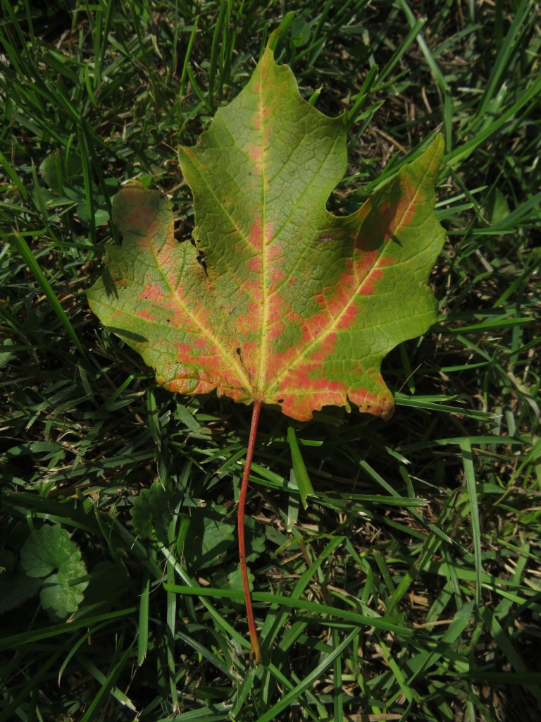 So as I was heading back inside, a flash of color caught my eye: What was that? No Way! A maple leaf? Yep–I stepped back and found multiple maple leaves, and that’s a fall thing, you know?