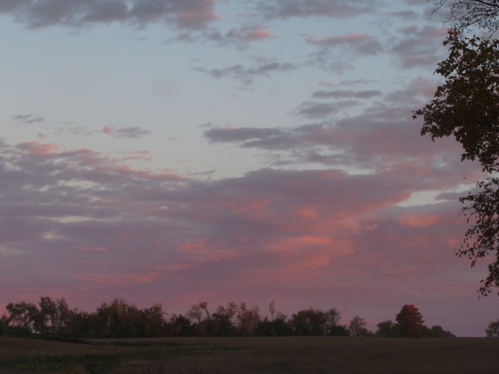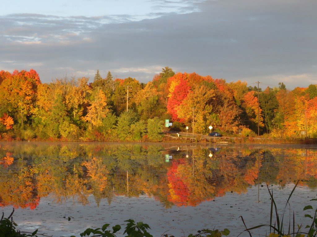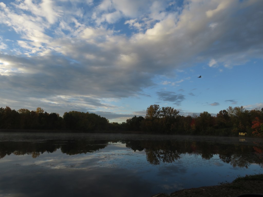 I couldn’t help but notice the beautiful, hippie-carnival colors of the trees. The bright pink sky had an influence, I’m sure, but still, those colors! Since I was free today until mid-morning, and Mr. Darcy was too, once he checked his calendar (he is so old-fashioned, doing everything on paper–like me!), we decided to head out to the lake at Louis Emory Park in Hillsdale to check out the scenery over there. (Okay, I decided. But he didn’t resist.)