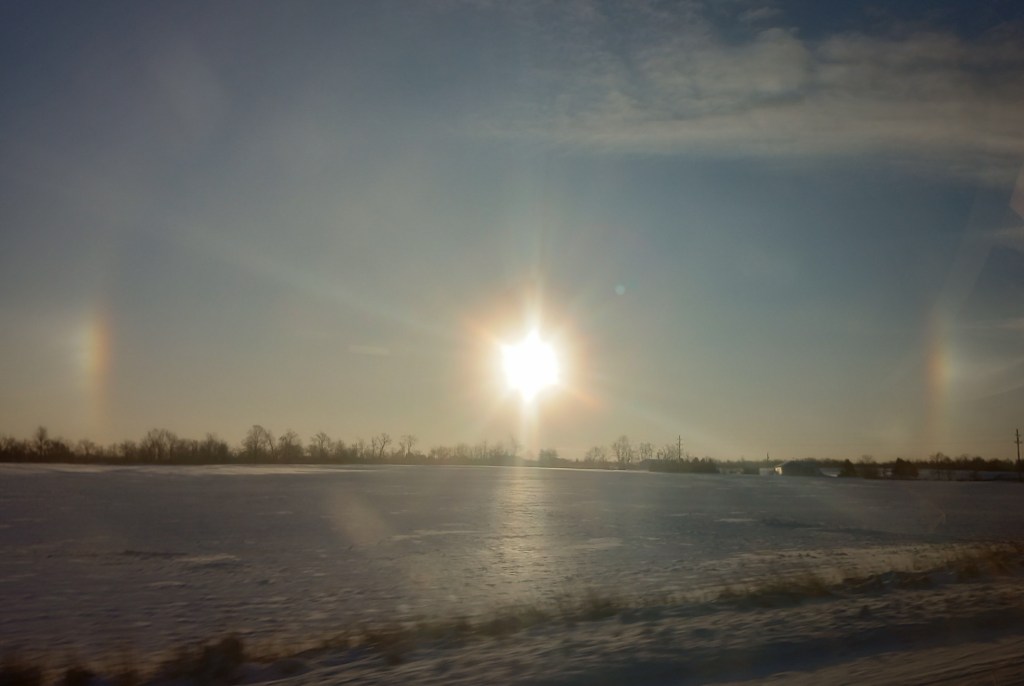 Then we got another unexpected (and rare) blessing: The eastern sky was lit with a beautiful pair of sun dogs next to the sun! (I actually thought it was a rainbow, but Tony pulled out the book and taught me the correct term. Ahem.)