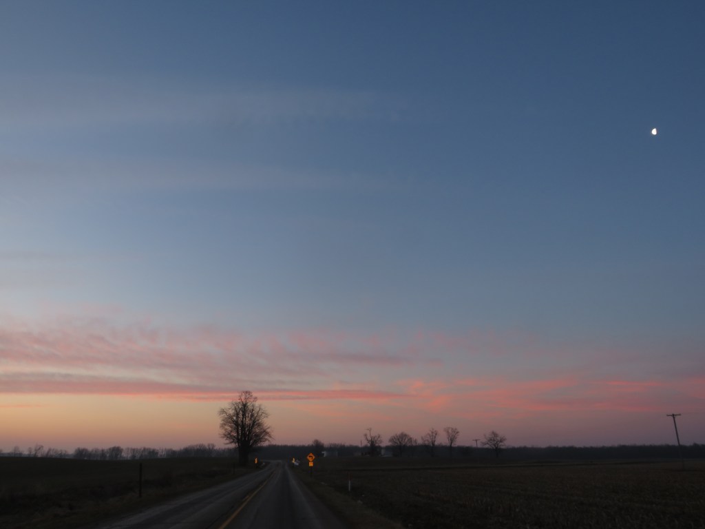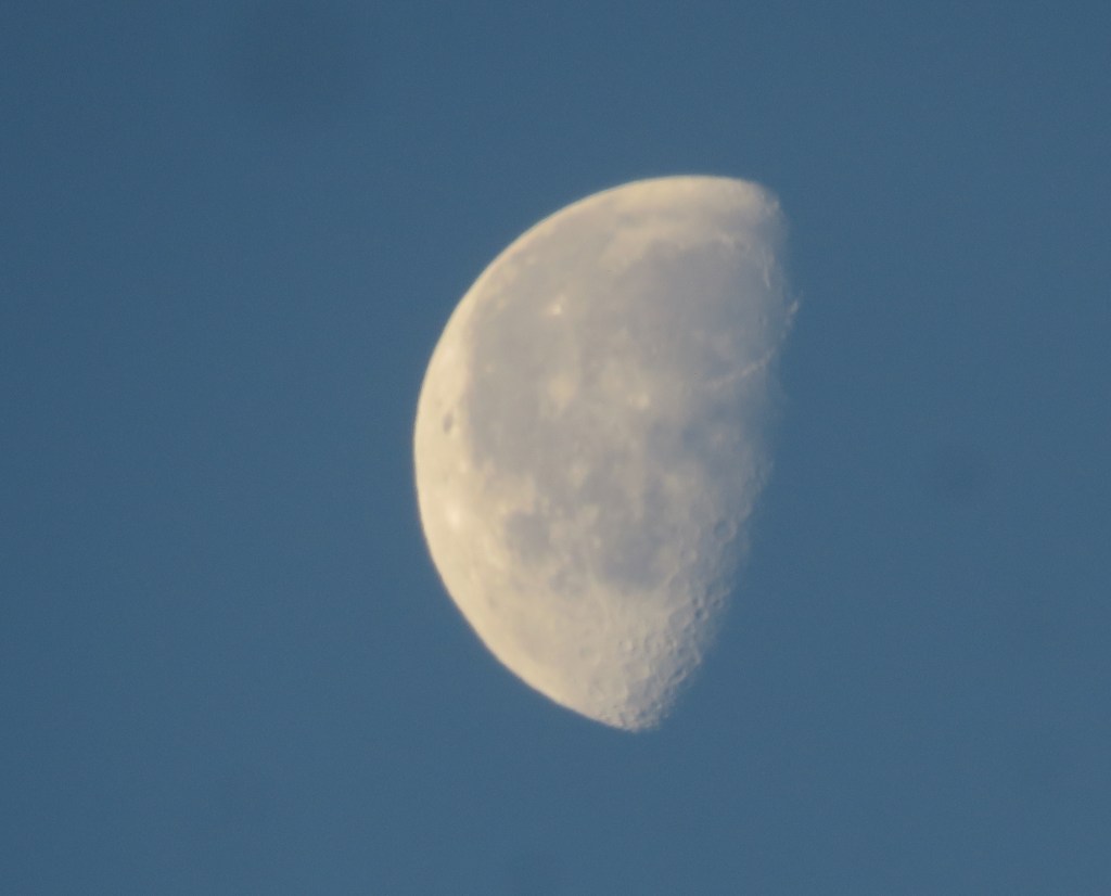 It started early in the morning, when I noticed that the moon was visible. I’ll show all three moon pictures I took that morning, because I want to show how it “vacillates.” That is the official term, but I call it “flipping.” To “vacillate” is to “waver,” and the implication is that the movement is minor. Well, judge for yourself. I am struggling to figure out how such a massive object could rotate so far in a little more than three hours. (And why?) The camera was perfectly parallel with the ground when each of the following was taken.