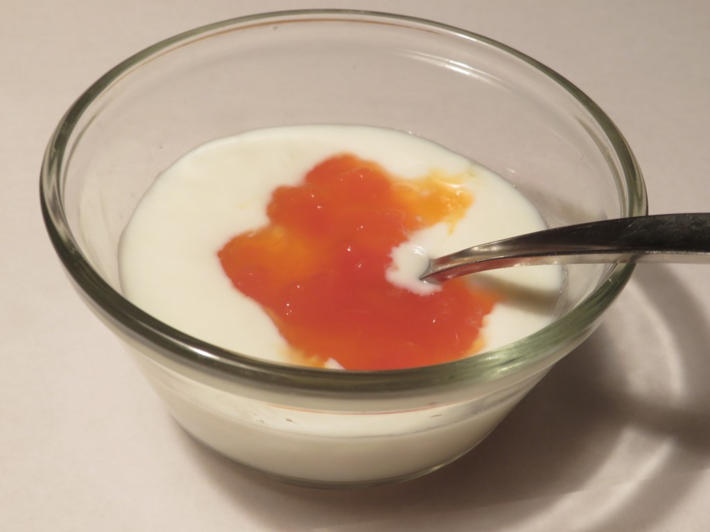 2) Put a tablespoon of yogurt into the bottom of the container (I used a quart jar), and stir in a little of the warm milk to break up the yogurt so it’s not in a clump. Make sure the temperature of the milk is around 80. If it’s too hot (over 100 degrees), it might kill off the active cultures in the yogurt.