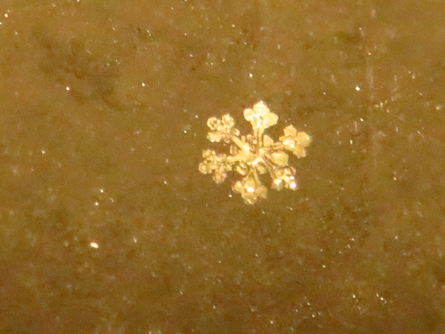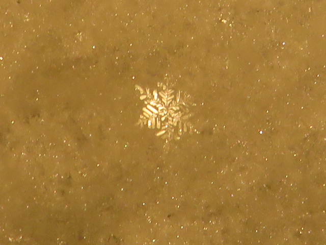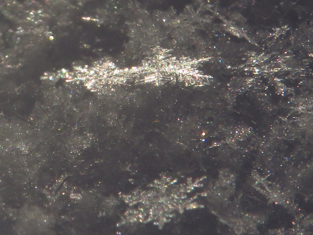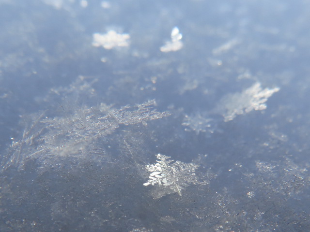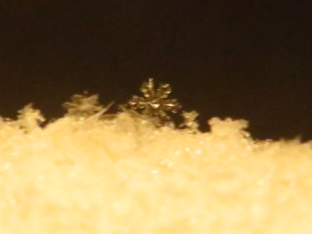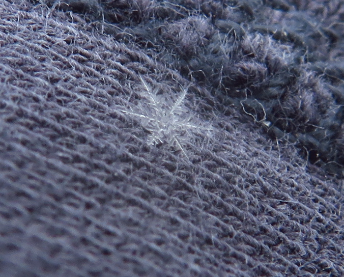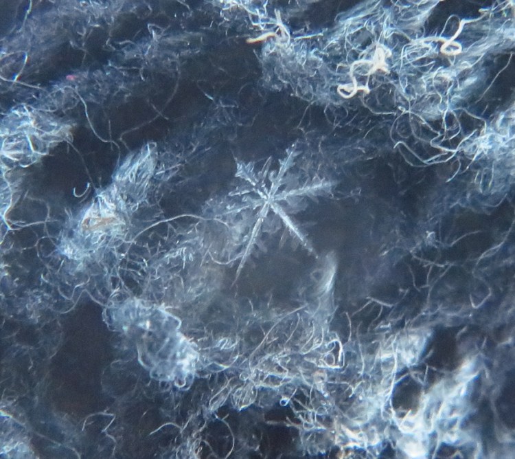 Back then, we didn’t have an old-fashioned camera, of course; but we experimented with our point-and-shoot camera and did some experiments with compound lenses (a jeweler’s loupe, a magnifying glass, eyeglasses, etc.) to try to get the tiny crystals in focus. My miracle camera now is much more technically advanced, but even with the help, it’s still a struggle to bring those snowflakes into focus.