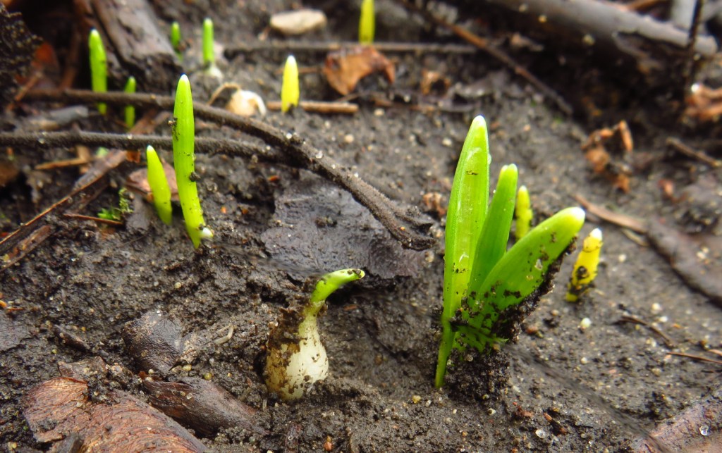 My brother, sister and I would push past the draped plastic (which felt like a playhouse to us when we were kids), and would enter the moist, warm chamber, which had moisture dotted on the plastic walls. We would crawl up on Dad’s stool each day to look for something to come up.