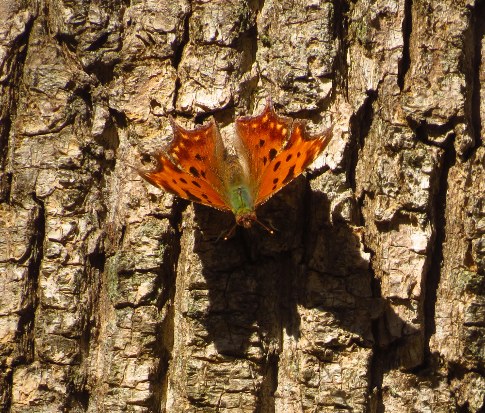 These amazing butterflies (Eastern comma butterfly) show up early on in the spring, and have a dark side to the outside of their wings. With wings closed, they camouflage well against the tree trunks. But when the wings open, surprise!
