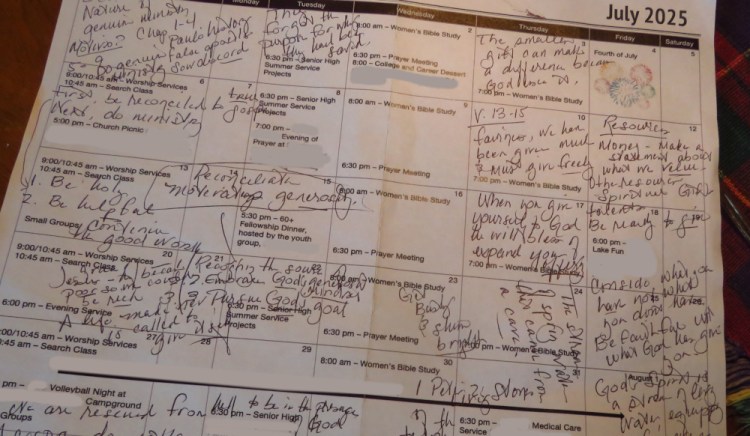 As I listened, I felt myself having one “ah ha” moment after another. I had no bulletin, and nothing to take notes on, so I used a copy of a calendar that I had taken from the foyer, and began to use the blank spots to write down little nuggets of information so that I could remember later.