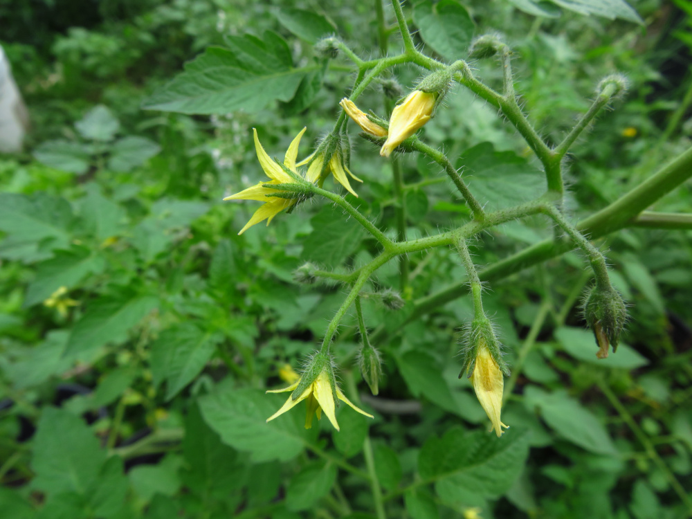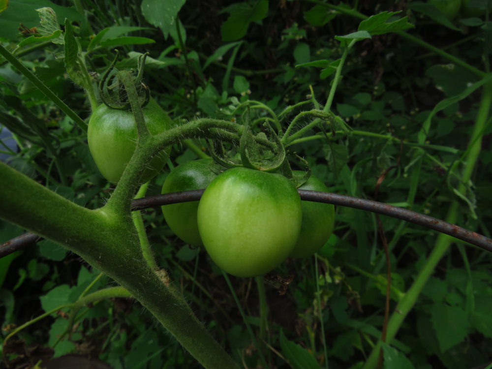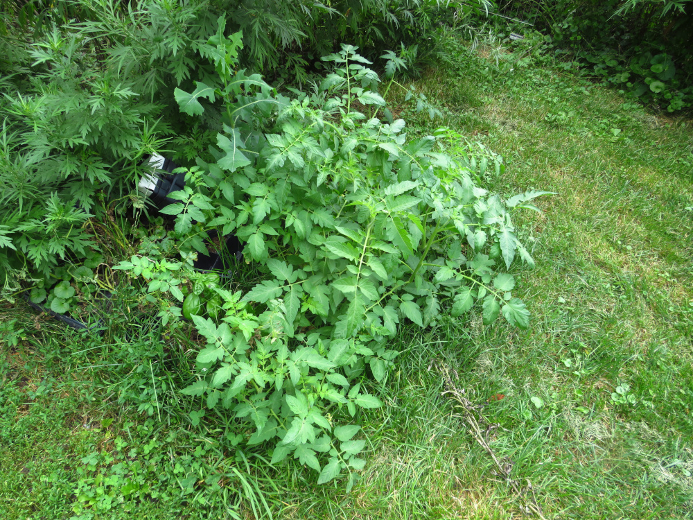 But I got another surprise when I stepped into the yard! An amazing tomato plant, which seemed to appear out of nowhere, was sprawled next to the herb garden. Confused, because I know we hadn’t put any tomatoes in a place where they would compete with the grass, I began to realize that the tomato was growing along the ground in search of light. It stretched all the way back under the lilac bush, where we had tossed the leftover seedlings that we thought were too small.