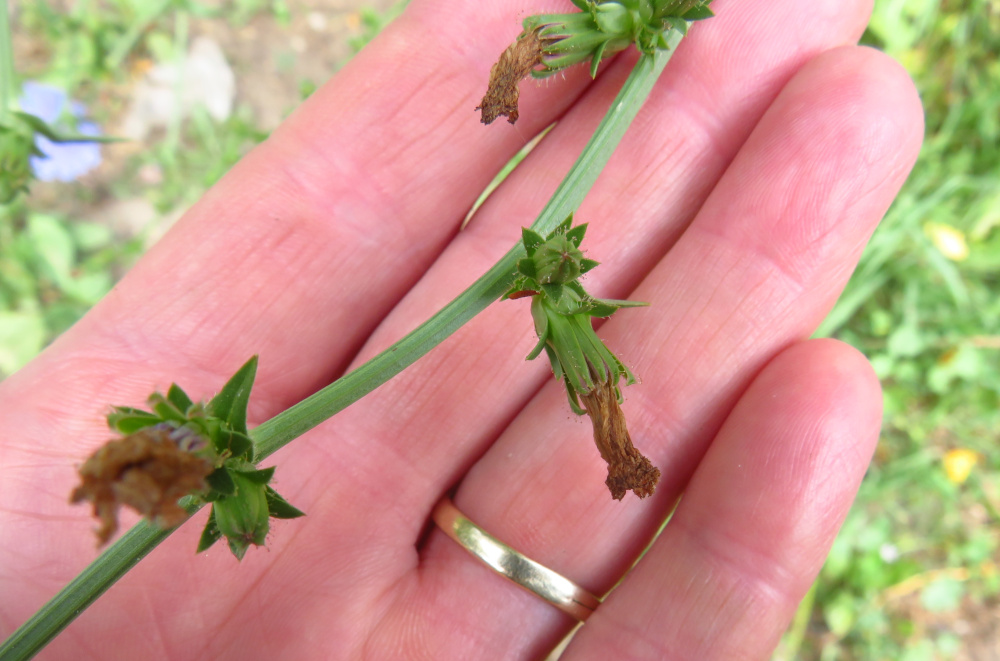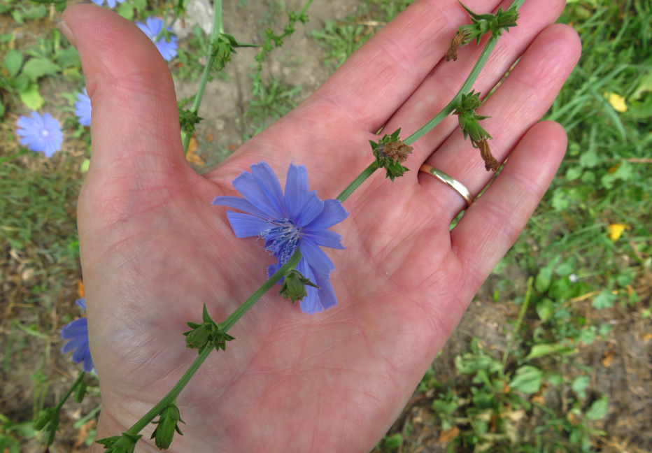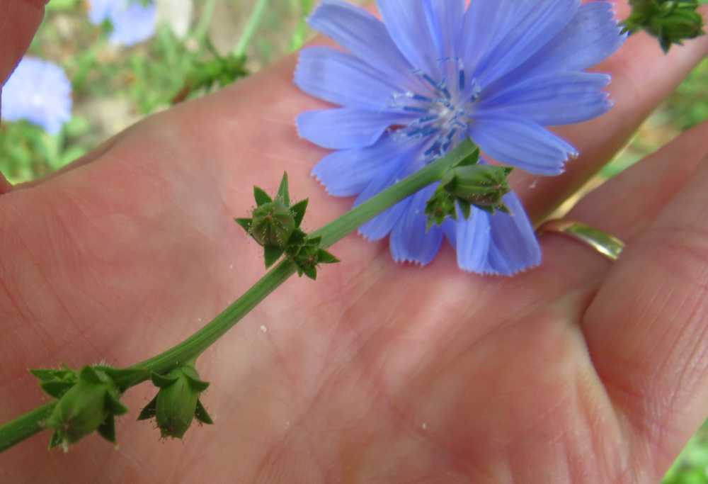 The three stages of the chicory flower: It blooms at the base, and grows from the tip, putting out new buds. The open blossom will usually be in the middle of the stem. Looks a little like a timeline, doesn’t it? (You are here!)