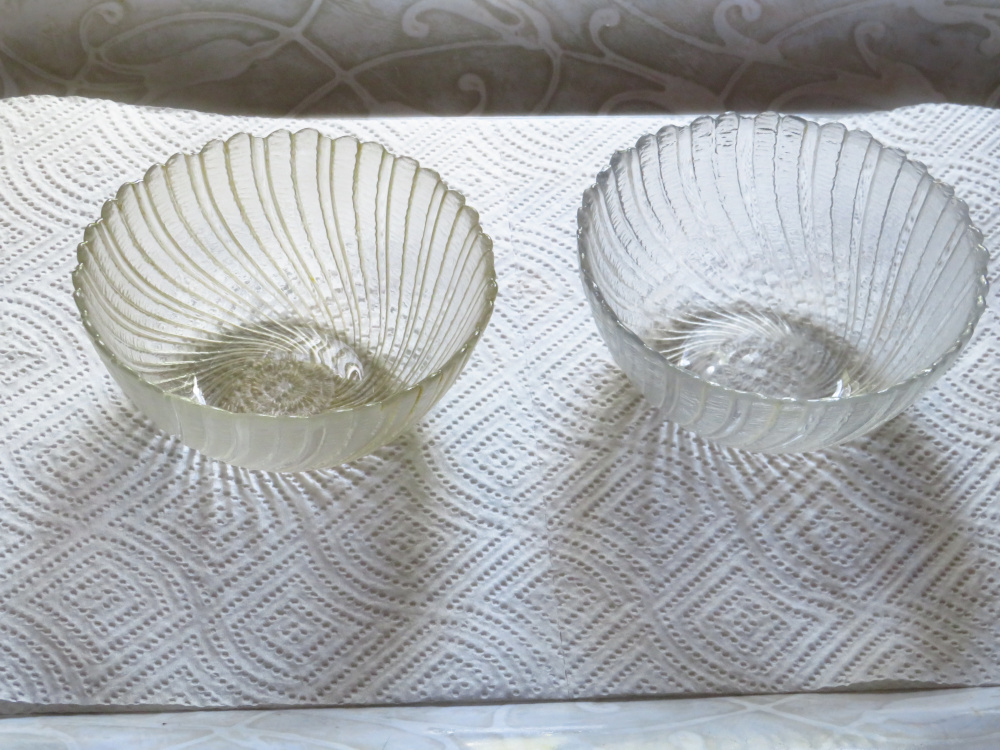 I have been blessed for the last few years to live in a place that has softer water. It’s nice to wash the dishes instead of having to scrub all the time. So I was surprised this morning when I washed the breakfast dishes and found that two of my clear glass bowls looked different from each other.