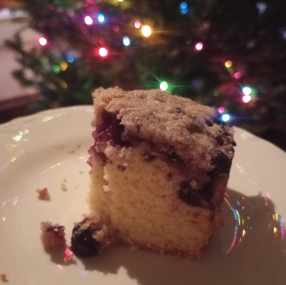 I wish I could explain the wonderful smell that crept out of the oven and inhabited the house! Warm, cinnamon, blueberry sweetness made the whole house smell the way looking at the Christmas tree made me feel! It baked for over an hour, and when it was done, we let it cool a little and then each one of us had a piece, while sitting in a circle around the pellet stove.